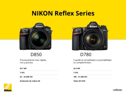 NIKON Reflex Series D850 D780 Procesamiento más rápido, Cuando la versatilidad y la portabilidad rico y preciso. se complementan. 45.7 MP 24.5 MP 7 CPS 7 CPS 64 – 25.600 ISO 100 – 51.200 ISO Grabación de videos 4K Video 4K UHD